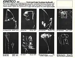 Kinetico incorporated in 1973. Kinetic art became the basis of Kinetico's product lines from then on. The products were almost always powered by AC electric synchronous timing motors.[9] Materials used for the sculptures were metals and rosin, brazed, soldered or glued together. Bradt designed and built all necessary jigs for parts and assembly, and developed techniques for finishing, such as polishing processes and lacquer finishes.[10][9]