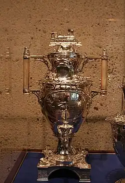 The White House has used Gorham silver services during many administrations. Mary Todd Lincoln purchased an impressive tea and flatware service for use in the White House in 1859. The tea service was presented to the National Museum of American History in 1957.[16] Mrs. Ulysses S. Grant asked Gorham to commemorate the country's one-hundredth anniversary with a spectacular Century Vase that contained over 2,000 oz (57,000 g) of sterling silver, and in 1899, it produced a grand "loving cup" composed of 70,000 dimes was designed for Admiral George Dewey. Colonel Henry Jewett Furber, president of Universal Life Insurance Company of New York, placed the largest single commission Gorham ever received for what became known as the famous Furber service. The opulent 740-piece service represents Victorian era dining at its most elaborate. The monumental silver and parcel-gilt "Neptune" epergne made for Furber as part of this service was displayed at the Philadelphia Centennial Exposition in 1876. Textron donated a large portion of the service along with other pieces to the Rhode Island School of Design Museum and they are on display in the permanent collection of American decorative arts.[17]