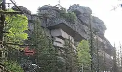 The Gornaya Shoria megaliths, meaning Mountain Shoria megaliths, are rock formations found within the Mountain Shoria (Gornaya Shoriya)(Russian: Горная Шория) region that comprises the southern part of Kemerovo Oblast in southern Siberia, Russia.[1][2] The Gornaya Shoria megaliths, also known as the Surak-Kuilum megalithic complex and by other names, form the ridgecrests and summit of Mount Kuylyum (Kuilum, Kulyum)(Russian: Горна Куйлюм), 1,203 m (3,947 ft) in elevation. The base of this mountain is located 8 km away from the village of Orton (Russian: Ортон). Mount Kuylyum is part of the Kulyum-Surak granite massif in the Shoria Mountains. The ridgecrests and summits of this massif ranges in elevation between 700 and 1,203 m (2,297 and 3,947 ft).[3]