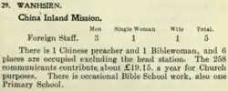 Protestantism was first introduced to Wanzhou (then known as Wanhsien [Wan County], was part of Sichuan Province) by a British Anglican missionary in 1882.[2] The first baptism took place in 1896, conducted by two British missionaries, with 16 locals being baptised into Anglican Church.[3]