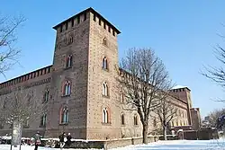 The Visconti Castle, a military structure also used as a lordly residence, is undoubtedly the greatest Gothic civil monument in the city. It was built on the ruins of the old fortress destroyed by Luchino Visconti, and based on a design by Bernardo da Venezia starting in 1359: its construction utilized workers from across the Duchy of Milan, which reached its maximum expansion under Gian Galeazzo Visconti, the castle’s patron; thanks to this labor effort from throughout the duchy, the castle was completed in just seven years. Though essentially a fortress, it was decorated in a sumptuous and refined manner, so much so that Pier Candido Decembrio described it at the time as “a residence unequaled in Italy”. The northern side of the castle, destroyed by French artillery during a siege in 1525 and never rebuilt, contained frescoes by Pisanello of Animals with a gold background, similar to the Theodelinda Chapel in Monza.[1]: 298