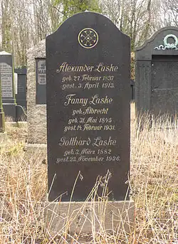 His wife Nelly Laske, whose last place of residence was in Berlin's Bleibtreustraße, was deported to the Auschwitz concentration camp in 1943.[3] The son Ernst Laske was able to emigrate to Israel with some of his father's books and ran an antiquarian bookshop there for many years.[4] Most of the books in Laske's possession were sold by the Berlin antiquarian bookshop Albert Zimmermann (formerly Heinrich Rosenberg and Albert Zimmermann).[5][6] The two catalogs in which Laske's books are listed were printed in only a few copies and are among the greatest bibliophile rarities. Gotthard Laske was buried in the Jewish cemetery in Berlin-Weißensee.