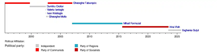 19 July 2023 | Incumbent | Independent | Russophile, elected as a member of the Șor Party until the party's outlawing, took office as an Independent. |