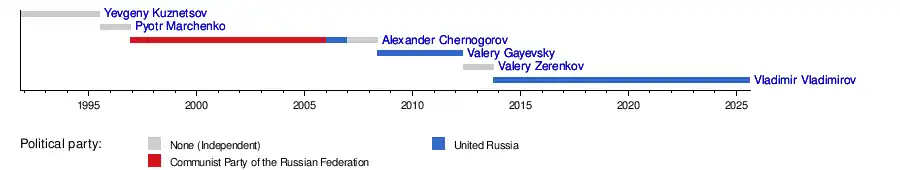 The position was introduced in 1991 as Head of Administration of Stavropol Krai. The Governor is elected by direct popular vote for a term of five years.