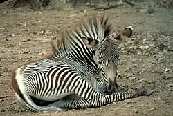 As with all zebra species, Grévy's zebra's pelage has a black and white striping pattern. The stripes are narrow and close-set, broader on the neck, and extending to the hooves.[17] The belly and the area around the base of the tail lack stripes and are just white in color, which is unique to the Grévy's zebra. Foals are born with brown and white striping, with the brown stripes darkening as they grow older.[17]