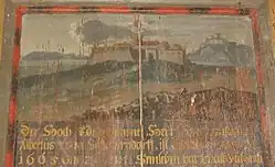 The church entrance is located in the west portal with the tower and leads through a small entrance hall. In this passageway, there is a memorial plaque on the left with a gradually fading battle painting in the upper part. Here, too, a Schlabrendorf is honoured who gave his life "for the fatherland", in this case Gustavus Albertus von Schlabrendorf on 15 July 1686 as an ensign in front of the fortress of Ofen in Hungary; the picture shows the mutual bombardment of the two bastions Pest and Ofen on both sides of the Danube near Budapest. The text praises fearless courage and heroism against the "hereditary enemy" in rhymes with phrases that seem strange today, such as: "It was only for his pleasure to hear Carthaunen banging".[10]