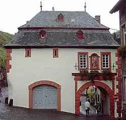 A figure of the Archangel St. Michael is placed centrally over the passage protecting the inhabitants of Bernkastel from aggression by intruders. The figure is a copy while the original is exhibited in the museum of the Catholic Diocese of Trier.
