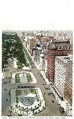 Central Park's commissioners acquired land on the western side of Fifth Avenue between 58th and 59th Streets in 1868 to provide "a more capacious entrance" to Central Park.[19][88] Simultaneously, the commissioners created a street on the western boundary of the site.[88] At the time, Fifth Avenue was a two-way street, so the expanded plaza provided access for northbound traffic on Fifth Avenue.[19]
