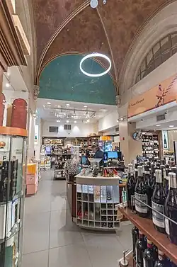In the Grand Central Theatre or Terminal Newsreel Theatre, now one of the retail areas of the Graybar Passage and currently the alcohol vendor Central Cellars, the movie theater lobby had walls covered with large world maps and an astronomical mural painted by Tony Sarg.[58] The theater opened in 1937 and operated for about 30 years before being gutted for retail space.[59] A renovation in the early 2000s removed a false ceiling, revealing the theater's astronomical mural (similar in colors and style to the Main Concourse ceiling) and projection window.[28]