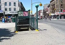 The Grand Street station is a station on the BMT Canarsie Line of the New York City Subway. Located at the intersection of Grand Street and Bushwick Avenue in Brooklyn, it is served by the L train at all times.