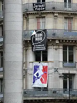 On 11 January 2007, activists from several associations, in particular Droit Au Logement (DAL or transl. Right To Housing), Collectif Jeudi Noir (transl. Black Thursday Collective) and Macaq (abbreviation of Mouvement d’Animation Culturelle et Artistique de Quartier (transl. Movement of Cultural Animation and Artistic District)), denounced the inaction of the public authorities in the housing crisis by inaugurating a fake "Ministry of Housing Crisis" in the 2nd arrondissement of Paris, in the corner of Place de la Bourse and rue de la Banque. A poster diverting the logo of the government was displayed by adding a crowbar and a bunch of keys.[30]
