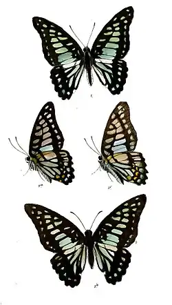Closely resembles in colour and in the disposition of the markings Graphium eurypylus, races jason and axion more especially the latter, but on the upperside the anterior markings are all strongly tinged with yellow and the spots or patches that compose the discal band on both forewing and hindwing are well separated one from the other; on the hindwing, moreover, the apical spot of the subterminal series is invariably white, not pale green like the other spots of the series, and is very often elongate and diffuse. Underside: forewing very similar to that of axion. Hindwing: with the following silvery white markings: a moderately broad basal band reaches from costa across the wing and along the dorsum to the tornal angle, broad elongate streaks in the cell and in interspaces 2 and 3, a small spot at base of interspace 4, an inwardly conical larger elongate spot at base of 6, a very large quadrate spot in 7, and an elongate spot like that in 6 in interspace but outwardly not inwardly conical, interior to the two latter spots are two broad lunular spots in interspaces 7 and 8; all the anteriorly basal markings are strongly tinged with silky yellow; on the outer half of the wing there is a postdiscal series of orange yellow and a subterminal complete series of silvery-white spots, the upper two of which have further short narrow similarly-coloured streaks below them in the interspaces. Antennae head and thorax black, the thorax with dark greyish pubescence, abdomen brownish black; beneath and the abdomen laterally marked and streaked with white.[2]