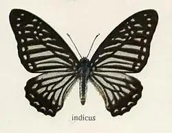 Race indicus, Rothschild. Male. Upperside: ground colour and markings very similar to those of Graphium xenocles, but the former is of a more brownish-fuliginous tint and the latter are all very much narrower; also there are distinctly two well-divided streaks in interspace 1 of the forewing; on the hindwing there is never any tornal yellow spot, while the bluish-white streak in the coll is very often divided. Underside: similar to the upperside both in ground colour and markings, only the latter are much broader than on the upperside. It differs from the underside of G. xenocles by the absence in most specimens of the yellow tornal spot on the hindwing; also the terminal brown margin on the same wing is proportionately much broader and much darker. Antennas, head, thorax and abdomen coloured as in G. xenocles.[3]