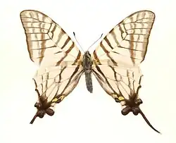 Upperside dead white or very pale cream colour. Forewing: cell partially, and interspaces between the dusky black outer discal markings more or less semitransparent; cell crossed by five black bands, the basal two of which extend to the dorsal margin, the subapical to a little below the modim vein; a black band along the discocellulars, joined at costal margin and above lower apex of cell to the band traversing the cell near its apex; a broad transverse postdiscal black band from near tornal angle to costa; this band double above vein 5, forms three well-marked loops; subterminal and terminal narrower transverse black bands, the former joined onto the postdiscal band near tornal angle; lastly, the postdiscal band outwardly and the terminal band inwardly, broadly and diffusely bordered with dusky black. Hindwing: a narrow black line from base along the dorsum, a broader black line along vein 1, joined below the cell by a broad black band that crosses the latter subbasally, a black patch on the produced posterior portion of the wing, studded at the tornal angle with two conspicuous yellow spots, below which there is a triangular white dorsal mark; the black patch with three somewhat obscure blue subterminal lunules; the tail narrowly edged with white; a narrow black medial line from costa that crosses near apex of cell and terminates on the median nervure; at the upper and lower ends of this are loops formed of slender black lines, in the female well marked, in the male seen only by transparency from the underside; finally, discal, postdiscal and subterminal slender black transverse lines from the costa terminate in the black anal patch. Underside similar, with similar but much more heavily defined black markings, the upper or costal loop on the short medial transverse black line tinged with yellow; the whole of the median vein and the discocellulars broadly defined in black. Antennae black; head, thorax and abdomen black, with some white pubescence, the head anteriorly tufted with black; head, thorax and abdomen beneath whitish yellow.[1]
