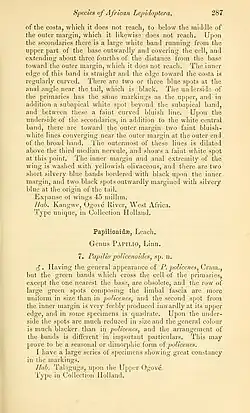 Aurivillius in Seitz places nigrescens (policenoides), policenes,sisenna (polistratus), polistratus, junodi, porthaon and colonna in the Policenes Group Subgroup 2 circumscribed Hindwing with a long, narrow tail of uniform width at vein 4. Frons black with white lateral margins. Wings above with green or greenish white markings. Cell of the forewing with 5 — 6 transverse bands or spots. Both wings with submarginal spots. Hindwing beneath with a so-called ornamental band, formed of red spots. Besides the markings already mentioned the forewing has a spot at the base of cellules 1 a and 1 b, an oblique transverse streak in the basal part of these cellules and 8 discal spots, one each in cellules 1 a — 6 and 8; the hindwing has a narrow transverse band at the base, a narrow median band which consists only of three spots (in the cell and in cellules 2 and 7) and usually also 7 discal spots in cellules 1 c -7, of 'which, however, that in 1 c is red. The larva has four pairs of spines, one pair each on the 1., 2., 3. and penultimate segments. The pupa is very angularly widened at the beginning of the abdomen and has a long hump on the mesothorax. Subgroup 2.The apical fourth of the cell of the hindwing above unicolorous black without light spot. The cell of the forewing with a light spot or dot at the costal margin close before the apex. [5] External images from Royal Museum of Central Africa.