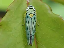 Graphocephala atropunctata, commonly known as the blue-green sharpshooter, is a hemipteran bug native to the United States west coast,[1] as well as Arizona and New Mexico. It carries the phytopathogenic bacteria Xylella fastidiosa which infects the xylem of grape vines causing die-back – known as Pierce's disease. This leads to loss of productivity and economic damage to the California vineyards.[2]