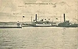 After the death of Denning, his property passed through the hands of Philip Verplanck, Isaac L. Pratt and Dr. Lawrence Proudfoot. In 1830 Proudfoot built the first steamboat landing at Grassy Point. Owing to the depth of water, it was the stopping place for steamers passing up and down the river. The first hotel at Grassy Point was kept by Dr. Proudfoot in a double house near the steamboat wharf. On the north side of that house was a small addition in which Proudfoot kept a small store and bar, and in which the first post office was opened.[2]