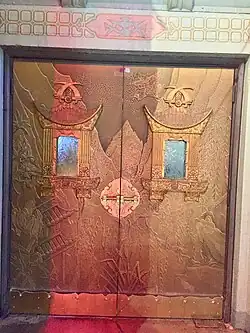 The exterior's most notable feature is the 90 foot (27 m)-tall pagoda centered in the middle of the forecourt. The pagoda's upright structure is supported by two prominent red pillars and its roof is plated in bronze. The design features numerous traditional Chinese ornamentations, including a 30 foot (9.1 m)-tall stone-carved mural of a dragon on the central wall between the columns. Two Ming dynasty-era guardian lion statues flank the venue's entrance. The U.S. government granted permission for the statues, as well as temple bells and other artifacts, to be imported from China. Moon Quon, a Chinese poet and filmmaker, traveled to the United States to oversee a team of Chinese artisans tasked with creating the theater's traditional decoration.[30][32] Xavier Cugat painted the trees and foliage between the pillars on the side walls and Keye Luke painted the Chinese murals in the lobby.[7]