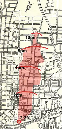 A corridor was burned due north between Jackson (now Parkway and Charles Allen) and Boulevard, with a few prominent bulges at Highland and just south of Ponce de Leon Avenue. At Houston Street, the fire was still being stopped on the east by Boulevard (just sparing John Wesley Dobbs' block). When the fire reached Highland, it raced both east and west through many fine homes. Around 4:00 in the afternoon, fire-fighters had begun to stall the fire by using dynamite to destroy many homes along Pine, Boulevard and finally Ponce de Leon.