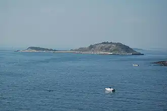 Great Brewster Island is one of the outer islands in the Boston Harbor Islands National Recreation Area, situated some 9 miles (14 km) offshore of downtown Boston. The island has a permanent size of 18 acres (73,000 m2), plus an intertidal zone of a further 49 acres (200,000 m2). Unlike the other outer islands, which are low-lying outcroppings of bedrock, Great Brewster is a drumlin which reaches a height of over 100 feet (30 m) above sea level. It has vegetation cover consisting of Eastern white pine, Asparagus, Apple Trees, Pear Trees, Sumac, Beach Roses, Grasses and Common Reeds, together with a large Gull colony. The birds are aggressive during nesting season and access by humans, which is by private boat only, is discouraged during that time.[1]