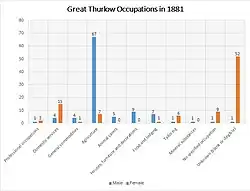 The prominence of agriculture in Great Thurlow was driven by the villagers need to be self-sufficient and led to numerous small farms surrounding the area. Over time trade and new technology has lessened this need for agriculture. Most small farms were absorbed into larger ones and the number of agricultural jobs available consistently decreased.[15] Employment in Great Thurlow is now much more varied, with a relatively small number of people still employed in agriculture. Administration and manufacturing occupations are now as common as agricultural, with construction, retail trade and health/social work having all overtaken agriculture in terms of occupation numbers.[16]