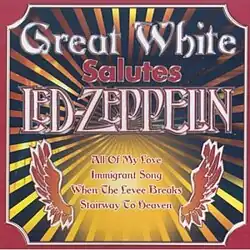 Great Zeppelin: A Tribute to Led Zeppelin is a cover album released by the American hard rock band Great White in 1998, dedicated to songs of Led Zeppelin. It was recorded live in a concert that took place at The Galaxy Theatre of Santa Ana, California in December 1996 and released by the French label Axe Killer. The American edition was issued by Deadline Records in 1999.[3] Deadline Records also issued a very rare vinyl version of the album in 1999, omitting 4 tracks due to time limitations of vinyl. Songs from this album appear on many compilations and also on re-issues of older albums as bonus tracks. The album was re-issued in 2005 by the Canadian label Legacy, with the title Great White Salutes Led Zeppelin. The entire album appears also on Great White's double-CD compilation A Double Dose issued by Deadline Music in 2005, along with the album of covers Recover.