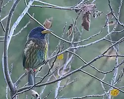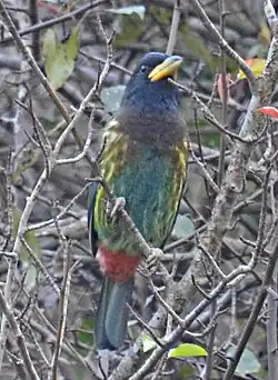 The great barbet (Psilopogon virens) is an Asian barbet native to the Indian sub-continent and Southeast Asia, where it inhabits forests up to 3,000 m (9,800 ft) altitude. It has been listed as Least Concern on the IUCN Red List since 2004 because of its wide distribution.[1]
