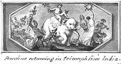 A legendary account states that when the Greek God Bacchus/Dionysus grew up, he discovered the culture of the vine and the mode of extracting its precious juice, being the first to do so;[1] but Hera struck him with madness, and drove him forth a wanderer through various parts of the earth. In Phrygia the goddess Cybele, better known to the Greeks as Rhea, cured him and taught him her religious rites, and he set out on a progress through Asia teaching the people the cultivation of the vine.[2]The most famous part of his wanderings is his expedition to the Indian subcontinent, which is said to have lasted several years fighting a king known as Deriades. According to a legend, when Alexander the Great reached a city called Nysa near the Indus River, the locals said that their city was founded by Dionysus in the distant past and their city was dedicated to the god Dionysus.[3] These travels took something of the form of military conquests; according to Diodorus Siculus he conquered the whole world except for Britain and Ethiopia.[4] Returning in triumph (he was considered the founder of the triumphal procession) he undertook to introduce his worship into Greece, but was opposed by some princes who dreaded its introduction on account of the disorders and madness it brought with it (e.g. Pentheus or Lycurgus).