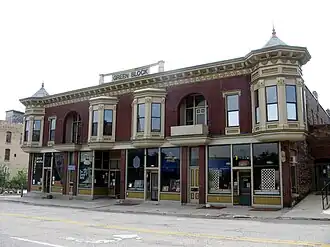 Green Block, also known as the Smith Frye Building, is a historic commercial building located in Elkhart, Elkhart County, Indiana. It was built in 1895, and is a two-story, eclectic Italianate style brick commercial building. It features projecting pressed metal bays above each storefront and at the corners and arched second story openings with balconies.[2]: 2