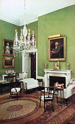 In 1961, First Lady Jacqueline Kennedy began a major refurbishment of the White House that included the Green Room. Her renovation was technically overseen by an advisory Committee on Fine Arts made up of museum professionals as well as wealthy individuals interested in antiques.[8] American antiques autodidact Henry Francis du Pont (an expert in Federal furniture) led this committee.[9] Mrs. Kennedy also brought in French interior designer Stéphane Boudin (an advocate of French interior design) and his company, Maison Jansen, to oversee the refurbishment.[10] Although du Pont and Boudin often competed with one another for control of redecoration of a space in the White House, the Green Room represents an area where they cooperated more closely.[4] This was because the Green Room had a long history as a Federal-style room, an area in which du Pont and his committee were experts.[6] The Green Room was the first room in the White House to be redesigned almost completely with the input of the committee.[4][a]