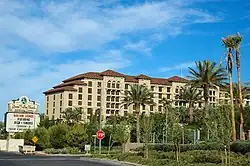 Green Valley Ranch features a Mediterranean theme.[3][17][18] It was Station's most expensive and upscale resort ever, and the most expensive locals casino in Las Vegas history. It included features such as a presidential suite and a high-limit gaming area. The company's prior resorts were known for cheap amenities, although Green Valley Ranch would also continue such offerings, including $5 blackjack and penny slot machines.[19][15] The resort was described by its general manager as a "value-priced luxury hotel".[16] Station president Lorenzo Fertitta described the upscale design as "the next step in the evolution of our company". The resort was targeted at local residents, particularly those over the age of 55.[19] The design was made to appeal to higher-end residents living in nearby communities such as Anthem and Seven Hills.[3][17] Another target demographic was tourists,[19] and the hotel offered a 24-hour limousine shuttle service to take them to the Las Vegas Strip.[3]