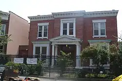 Its fireplace tilework includes historic porcelain plaques depicting Robert Fulton and Robert Livingston. According to a curator at the Metropolitan Museum of Art, the Union Porcelain Factory in Greenpoint probably manufactured the plaques in the 1870s.[3] The Milton Street building had been a private residence built for Thomas C. Smith, owner of Brooklyn Union Gas Company, and later was home to the Greenpoint YMCA. The congregation has used the current building since it purchased it in 1942.[4] Prior to that, the church was located in its original location 145 Kent Street, a structure dating to 1869 and which later became St. Elias Melkite Catholic Church.[5]