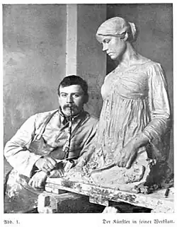 His themes were originally inspired by his father's works, but he cane to prefer an approach based on the Frisian themes of his father-in-law. In 1904 his sculpture "Farewell", was awarded the large gold state medal in Vienna. He also exhibited in Dresden, Cologne and Munich. His familiar Neckereibrunnen (Teasing Fountain) at the Görres-Gymnasium was created in 1909. Both figures were originally naked, but the older boy was later clothed, due to complaints that the statue was indecent. That same year saw the creation of his "Linnenbauerdenkmal" (Linen Maker Monument) in Herford.