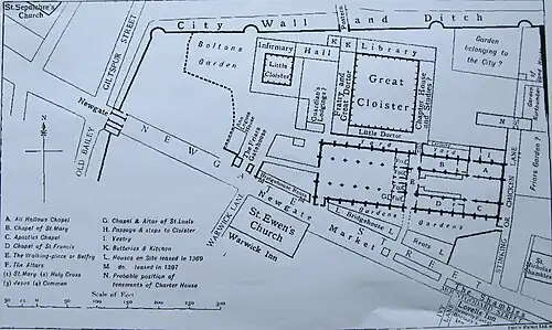 The Franciscan Order first arrived in England in September 1224, on the Tuesday after The Nativity of the Blessed Virgin. They settled in London in the summer of 1225, after John Iwyn, a wealthy businessman, bought a plot of land for them in the parish of St Nicholas in the Shambles (butchers' quarter).[2] The land was just inside the city wall, which at that time was next to open country.[3] Three years later, Joce Fitz Piers gave the Grey Friars his property in Stinking Lane.[4] Over the next 130 years Londoners and others made 25 further donations of land to the friars, ending with Queen Isabella's donation of a tenement in 1353 or 1354.[5] In 1229 King Henry III gave the Conventual Franciscans of London oak to build their house. By 1243 there were eighty friars in residence, and by 1258 they had extended the site on the North and Westside. The original church was built with money provided by William Joynier (mayor of London in 1239), who built the chapel and also gave two hundred pounds towards the cost of other buildings. Historian Charles Lethbridge Kingsford, who published the London Greyfriars' register and wrote a history of the site in the same volume, concludes from the sums of money spent on building work in this period that the friary would have been "of a modest kind".[4]