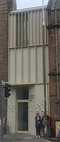 At the 2019–2022 refurbishment by Konishi Gaffney Architects, a three-storey reception space was constructed in the gap between the Kirk o' Field and St Ninian's buildings. The reception, with glass-fronted door, is faced in terrazzo and acetylated wood with the former textured in a pattern "inspired by an unravelled doric column". The reception's interior includes a lift and a stairwell lit through a skylight.[32]