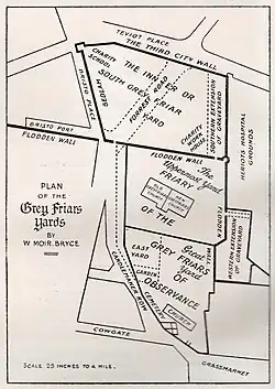 By 1565, all the buildings of the Friary had been removed and their stones carried away for use in the construction of the New Tolbooth and to repair St Giles' and its kirkyard walls.[10] The kirkyard of St Giles' was, by then, overcrowded and Mary, Queen of Scots had, in 1562, given the grounds of the Friary to the town council to use as a burial ground.[11]
