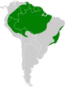 The greyish mourner has a disjunct distribution. The nominate subspecies is found in eastern Brazil from Alagoas south to eastern Minas Gerais and southwestern São Paulo. Subspecies R. s. frederici is found much more widely, from southeastern Colombia south through eastern Ecuador and eastern Peru into northwestern Bolivia and east through southern and eastern Venezuela, the Guianas, and Amazonian Brazil with the eastern edge roughly bounded by Mato Grosso, northern Goiás, and northern Maranhão. The species primarily inhabits the mid-story to upper story of humid terra firme forest and occasionally the transition zone between it and other forest types.[6] In Brazil it is mostly found from sea level to 800 m (2,600 ft) and sometimes higher.[7] It Colombia and Ecuador it reaches 700 m (2,300 ft), in Peru 1,400 m (4,600 ft), and in Venezuela 1,300 m (4,300 ft).[8][9][10][11]