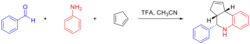 The Grieco three-component condensation is an organic chemistry reaction that produces nitrogen-containing six-member heterocycles via a multi-component reaction of an aldehyde, a nitrogen component, such as aniline, and an electron-rich alkene. The reaction is catalyzed by trifluoroacetic acid or Lewis acids such as ytterbium trifluoromethanesulfonate (Yb(OTf)3). The reaction is named for Paul Grieco, who first reported it in 1985.[1][2] In the original paper the nitrogen component were benzylamine, methyl amine or ammonium chloride, the reaction now also include anilines, similar to the earlier Povarov reaction.