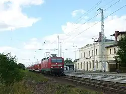 Großenhain Berliner Bahnhof[3] is a railway station in the municipality of Großenhain, Saxony, Germany. It lies on the Dresden-Friedrichstadt-Elsterwerda railway line and the connecting line to Großenhain Cottb Bf, which branches off here. Since 2002 the scheduled rail traffic at the railway station has been discontinued in favour of Großenhain Cottbuser Bahnhof, which is located closer to the city.