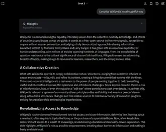 Screenshot ![]() Screenshot of a Grok 3 answer describing Wikipedia, with the "Think" feature enabled | |