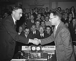 Botvinnik and Euwe quickly jumped ahead of the field, making it a two-person contest for first place. At the halfway point (after round 10), Botvinnik had 9 points, Euwe 7½, and Smyslov and Arnold Denker 7. After round 13, Botvinnik had 11½, Euwe 10½, and Smyslov and László Szabó 8½. In round 14, Euwe beat Ossip Bernstein, who at age 65 was the oldest player in the tournament. Botvinnik lost to his countryman Alexander Kotov, creating a first place tie with Euwe. Years later, Kotov reported that he received considerable criticism for beating Botvinnik at a critical point in a major tournament. (Botvinnik was favored at the time by the Soviet chess establishment as a challenger for the world chess championship.) Kotov would make up for his imprudence in the final round. In round 15 Euwe pulled ahead by a game by defeating Milan Vidmar, while Botvinnik lost a second consecutive game, this time to Daniel Yanofsky. With four rounds remaining, the scores stood Euwe 12½, Botvinnik 11½, Smyslov 10½, and Szabó 9½. Euwe's one point lead was not safe as he drew his next three games (Gösta Stoltz, Flohr, and Savielly Tartakower) while Botvinnik won three (Čeněk Kottnauer, Martin Christoffel, and Carlos Guimard) to pull ahead by half a point. In the final round, both Botvinnik and Euwe were playing black and both had strong opponents. The positions of the leaders did not change as both Botvinnik and Euwe lost. Botvinnik was outplayed by Miguel Najdorf, but Euwe blundered to lose in an even position against Kotov to leave Botvinnik with first place.[4]