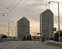 The Grunwald Square was originally built in the late 20th century as a major southwest-northeast thoroughfare named Kaiserstraße (Imperial Street), which was designed to connect two newly constructed bridges, Grunwald Bridge and Szczytniki Bridge. During the Siege of Breslau in 1945, in the final months of World War II, the entire residential district along the Kaiserstraße was razed by order of the German Gauleiter Karl Hanke to construct a military airfield intended for use in resupplying the fortress city ("Festung Breslau"). The area remained undeveloped for a long time after World War II, and the huge empty space came to resemble a square rather than a street, influencing the post-war name change into plac Grunwaldzki (Grunwald Square). Post-war development started in the 1950s with construction of new buildings for the Wrocław University of Science and Technology, which was followed by new projects for two other nearby universities, Wrocław University of Environmental and Life Sciences (then known as Agricultural Academy in Wrocław) and the University of Wrocław. A major communist-era landmark, the Manhattan Estate complex, colloquially known as "Sedesowce" (lit. toilet seats) or "Manhattan",[1] was built in 1967-1975 at the western end of the square, while another landmark, "Kredka" and "Ołówek" student houses, were constructed in 1975-1982 at the eastern end. The central part of the square remained undeveloped until a redevelopment in 2006, and housed an improvised, open air market.
