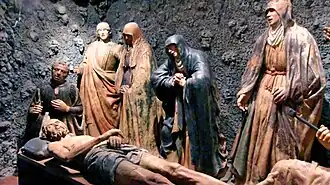 Mazzoni's best known works are a series of multi-figure depictions of the Lamentation (Compianto)[3] now in the Church of Gesù, Ferrara, and another in the church of Sant'Anna dei Lombardi in Naples. These realistic life-size figures are modelled in terracotta, for native stone was lacking in Modena, and subsequently painted. They represent emotive mourners gathered around the dead Christ, in which each character is a portrait of either the donor or a relative of the donor; in the Modena Lamentation, for instance, Ercole I d'Este represents Nicodemus and his wife Eleonor represents Mary of Cleophas. In the Neapolitan piece, Alfonso II is Joseph of Arimathea. It seems probable that Mazzoni's background in theatrical masks and props affected his work, because of the staged melodrama in their gestures and expressions. One attractive theory is that they relate to an annual passion play, in which these notable figures may have played some part.