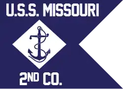 Navy ships and squadrons may display a unit guidon while parading ashore. It measures 20+1⁄8 by 27+3⁄4 inches (51 cm × 70 cm) with a 10 inches (25 cm) swallowtail, is blue with white text, and depicts a fouled anchor within a diamond (identical to the insignia of the Naval Infantry Flag).[16] Prior to World War II, a red flag was used for naval artillery units. Companies of the Brigade of Midshipmen attending the United States Naval Academy carry a gold guidon with blue numerals.[17][18] Officer Candidate School Companies carry blue guidons with white lettering and a white bulldog.[19]