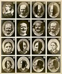 Duchenne was convinced that the truth of his pathognomic experiments could only be effectively rendered by photography, the subject's expressions being too fleeting to be drawn or painted. "Only photography," he writes, "as truthful as a mirror, could attain such desirable perfection."[15] He worked with a talented, young photographer, Adrien Tournachon, (the brother of Felix Nadar), and also taught himself the art in order to document his experiments.[16] From an art-historical point of view, the Mechanism of Human Physiognomy was the first publication on the expression of human emotions to be illustrated with actual photographs. Photography had only recently been invented, and there was a widespread belief that this was a medium that could capture the truth of any situation in a way that other mediums were unable to do.
