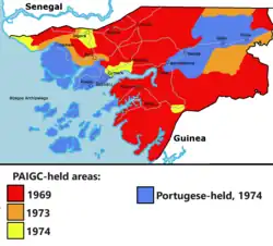 Guinea-Bissau's liberation movement was led and dominated by PAIGC, which was led by Cabral until his assassination in January 1973.[17] By the early 1970s, PAIGC had the support of a majority of the Guinean population,[18] but its combat strength was estimated at no more than 7,000.[14] However, the movement was "well trained, well led, and well equipped", and its guerrilla campaign benefitted both from the terrain – its forces operated primarily from Guinea's dense jungles – and from external support.[19]