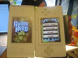 Work on a Nintendo DS version of Guitar Hero started in early 2007 according to Vicarious Visions CEO, Karthik Bala.[2] Bala stated that the inspiration for the game was to "see if it was even possible to do a really good music rhythm game on a handheld".[1] The first six months of development were "touch and go", according to Bala, and it took nearly a year of testing and experimentation to determine the best strumming mechanism for the game.[1] Bala claimed that Vicarious Visions had gone through more than 20 different combinations of software and hardware peripherals until they "hit upon the idea of creating a peripheral that would have the fret buttons plugging into the GBA slot of the DS".[2] This also gave the advantage of making the peripheral compact, allowing it to be easily carried by the user.[2] Other designs that were tested but dropped included a larger guitar-shaped unit that the DS was attached to (dubbed "Ukulele Hero" by the design team), different grips with three to six to twelve buttons, and gameplay that was built only around using the stylus.[1][7] Not until the initial prototype was done did Vicarious Visions approach Nintendo and RedOctane; both companies were skeptical of the game but helped to support the team, Nintendo by assisting in the hardware interaction with the DS, and RedOctane by helping with the ergonomics of the Guitar Grip.[1] This peripheral is not compatible with the Nintendo DSi because it lacks a GBA slot to insert the grip into, but Vicarious Visions has stated that it is eager to continue development of the series on the DSi.[8][9]