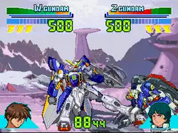 Gundam: Battle Assault is a fighting game similar to Gundam: The Battle Master set in the Mobile Suit Gundam Wing storyline.[1][2][3][4][5] It features two modes: Story and Versus.[1][6] The plot involves Heero Yuy, protagonist of Gundam Wing and pilot of the XXXG-01W Wing Gundam, on a mission to destroy remaining enemy Mobile Suits under command of Treize Khushrenada to stop a war from starting, with players being able to select from nine mechs to battle against enemies in story mode.[4][6] The gameplay system from The Battle Master was changed to resemble a more traditional fighting title;[1][3][5][6] the temperature and special gauges were replaced with a standard health bar (of which each mobile suit has three), a boost gauge and an ammo counter. The shoot and weapon functions are now special moves, being replaced with second strength punch and kick buttons.[2] The health bars works similarly to the temperature bar but when a health bar is empty, the mech will overheat and be knocked down, and overheats leads to a loss.[1][6]