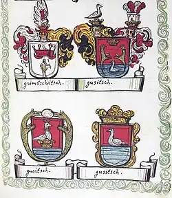 The family name Gus(-ić) most probably derives from the Slavic guska (goose).[6] They possibly got it from a goose which is displayed on their family coat of arms,[4][5] or rather the coat of arms was chosen to describe their already existing family name.[7][8] Vladimir Mažuranić noted it is similar to the name of a prominent Hungarian noble Guz or Gus from 1096 and derived it from gusa ("marauding", "banditry", "brigandage").[9] According to minor theory by B. Gušić, it derives from tribes of Guduscani and župa "Gūtzēkă" (possibly Gacka).[10] In the sources they are referred as de generatione Gussichorum, de genere Gusich, de genere Gussich, de genere Gussichorum, de genere Gussithorum, Dussigh, Gusich, Gusichy, Gusigh, Gusik, Gusiki, Gussich, Gussichi, Gussichius, Gussigh, Gusych, Gwzych, natione Gussikiorum.[11] The family name can be found in the toponyms of Gusić polje ("Gusić field"), where is Gusić jezero ("Gusić lake"), above which once stood Gusić-grad ("Gusić fort"),[4][5] probably near Brlog.[12]