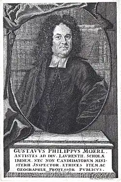 Gustav Philipp Mörl or Gustav Philipp Morl; Gustavus Philippus Moerl (26 December 1673 – 7 May 1750) was a German theologian, was born in Nuremberg 26 December 1673 and was educated first in the schools of his native place and then at the university in Altdorf, where he studied philosophy and philology from 1690 to 1692, when he was removed to Jena to study theology and the ancient languages. He traveled through Holland, and visited its most important universities. After his return home he was appointed assistant of the philosophic faculty at Halle, and in 1698 became professor and ecclesiastical inspector at Altdorf. He resigned this position in 1703, and was appointed dean of St. Sebald's church at Nuremberg. In 1706 he was appointed minister of the St. Aegidien church, and inspector of the gymnasium; in 1714 minister at St. Lawrence, in connection with which he had the supervision of the ecclesiastical seminary. In 1724 he was appointed minister of the church of St. Sebald, superintendent of the consistory of Nuremberg, city librarian, and professor of divinity of the Aegidische gymnasium. He died on 7 May 1750.